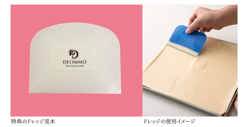 生地を平らにならしたりクリームを塗るために欠かせない、ドレッジ(カード)をプレゼントいたします。ドレッジは、手のひらサイズのヘラのような製菓道具で、江口シェフのお店「DEL'IMMO(デリーモ)」のオリジナルロゴが入った非売品です。